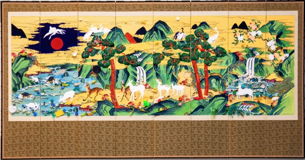 신십장생도 170x336(cm)병풍에 아크릴릭. 바다쓰레기 2021