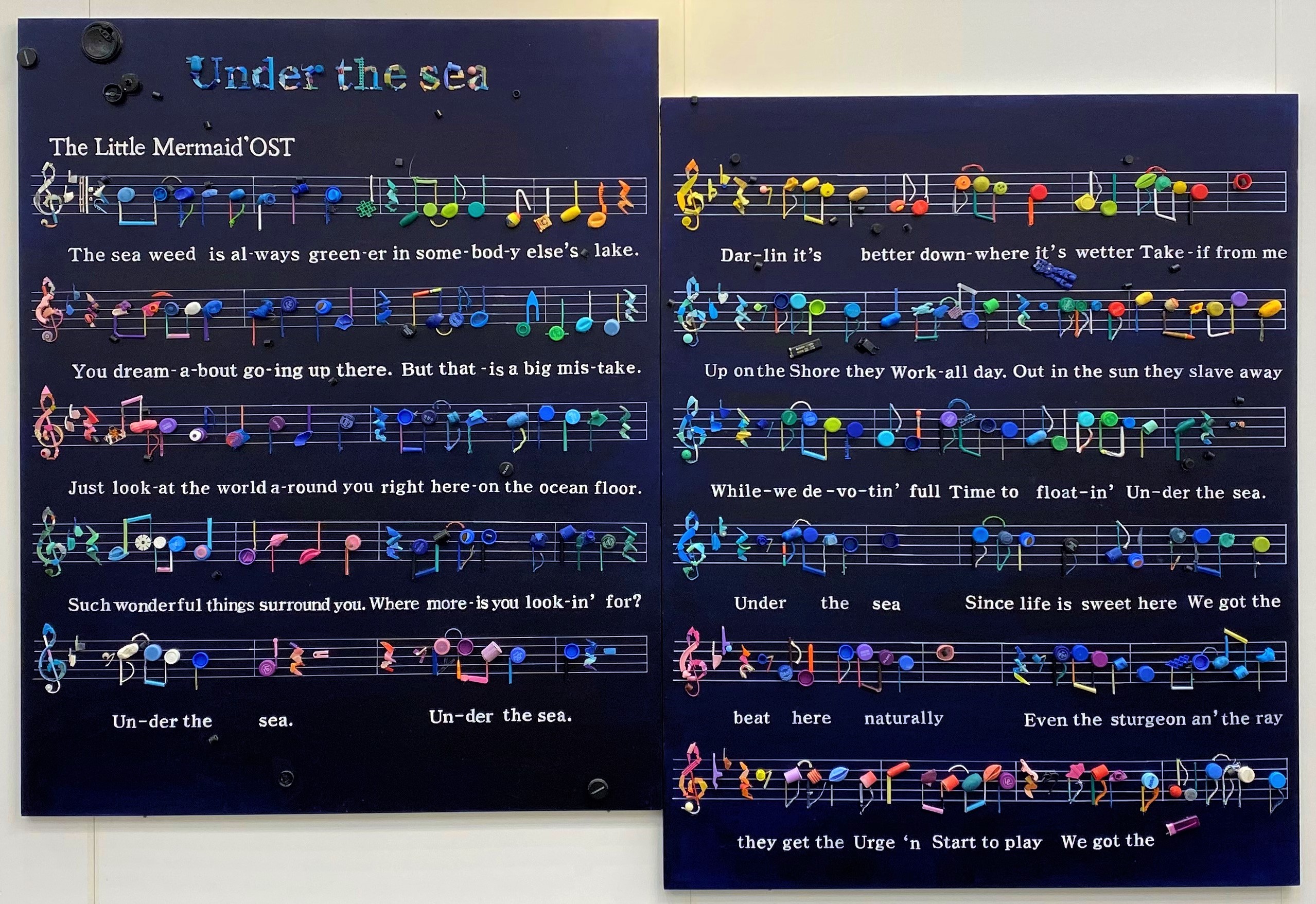 바닷속의 아름다움을 자랑스러워하는 세바스찬의 노래 under the sea 악보를 바다에서 주운 쓰레기로 그렸다. 노랫말과 달리 바닷속은 인간이 버린 쓰레기에 덮여가고 있다.